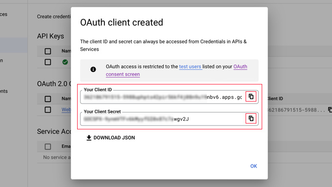 اکنون آخرین کاری وجود دارد که باید دوباره در برگه مرورگر Google Cloud انجام دهید. همچنان باید پنجره شناسه مشتری و راز مشتری خود را ببینید. میتوانید با کلیک روی «OK» در پایین پنجره را ببندید.