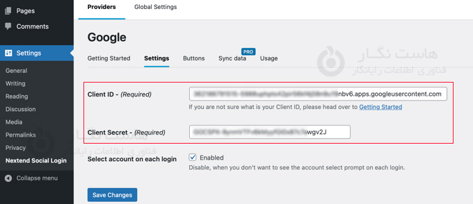 اکنون، به سادگی به تب وبسایت خود بازگردید و در زیر تنظیمات » Nextend Social Login کلیک کنید. در اینجا فیلدهای Client ID و Client Secret را خواهید دید.