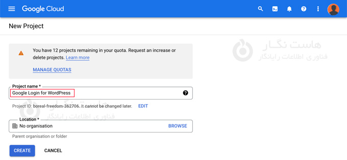 با این کار صفحه پروژه جدید باز می شود. شما باید یک نام پروژه اضافه کنید و مکان آن را انتخاب کنید. نام پروژه می تواند هر چیزی باشد که دوست دارید، مانند «Google Login». اگر با استفاده از یک حساب Google Workspace وارد سیستم شده اید، مکان به طور خودکار با نام سازمان شما پر می شود. اگر نه، پس باید آن را به عنوان "No organization" رها کنید.