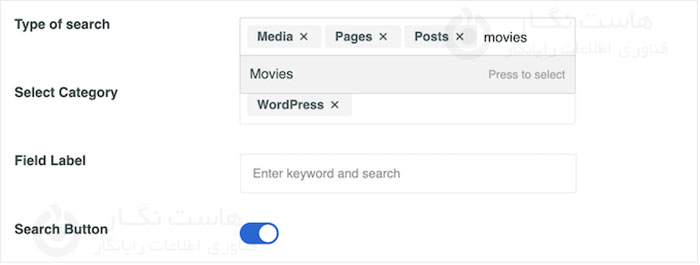 به سادگی میتوانید هر نوع پست سفارشی را که می خواهید وارد کنید، اضافه نمایید. وقتی نوع پست سفارشی مناسب ظاهر شد، برای افزودن آن به جستجو کلیک کنید. و در صورتی که میخواهید رسانه ها، صفحات یا پست ها را از نتایج جستجو حذف کنید فقط روی «X» کوچک کنار آن ها کلیک کنید.