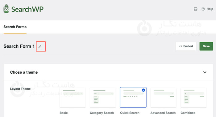 پس از آن، میتوانید یک طرحبندی (Layout) برای سرچ باکس خود انتخاب کنید. برخی از این طرحبندیها برای فرمهای جستجوی خاص طراحی شدهاند. به عنوان مثال، اگر در حال ایجاد فرمی هستید که بر اساس دسته بندی در وردپرس جستجو می کند، «Category Serach» از قبل بسیاری از تنظیمات مورد نیاز شما را دارد.