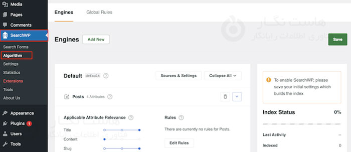 همچنین میتوانید قوانینی ایجاد کنید که تعیین میکنند آیا دوس دارید که محتوای خاصی در نتایج جستجو نشان داده نشود یا اضافه شود. وقتی از تنظیم الگوریتم جستجو خود را به اتمام رساندید، به بالای صفحه بروید و روی «ذخیره» کلیک کنید. SearchWP اکنون ایندکس را بازسازی می کند. بسته به سرعت اتصال به اینترنت و ارائه دهنده هاست وردپرس شما، ممکن است چند دقیقه طول بکشد. به محض مشاهده "Index Status 100%" بدانید که SearchWP تمام محتوا و قوانین شما را به فهرست جستجو اضافه کرده است.