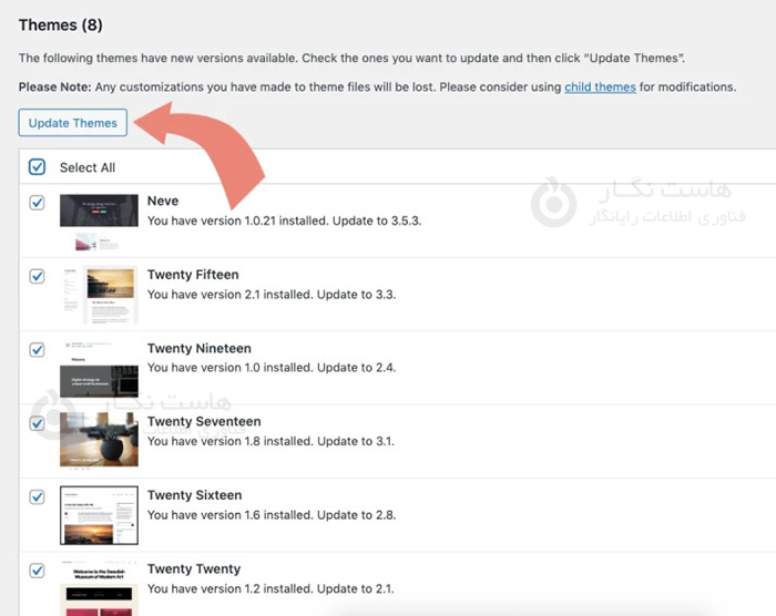 به همان صفحه به روز رسانی وردپرس برگردید و این روند را برای تم ها تکرار کنید. (به هر حال، مطمئن شوید که افزونه های شما با موفقیت به روز شده اند. پس از بازگشت باید یک پیام تشکر را مشاهده کنید.)