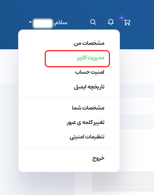پس از لاگین و ورود به حساب خود در هاست نگار میتوانید از طریق منوی سمت چپ بالا با هاور بر روی قسمت پروفایل خود زیر منوی "مدیریت کاربر" را کلیک نمایید.