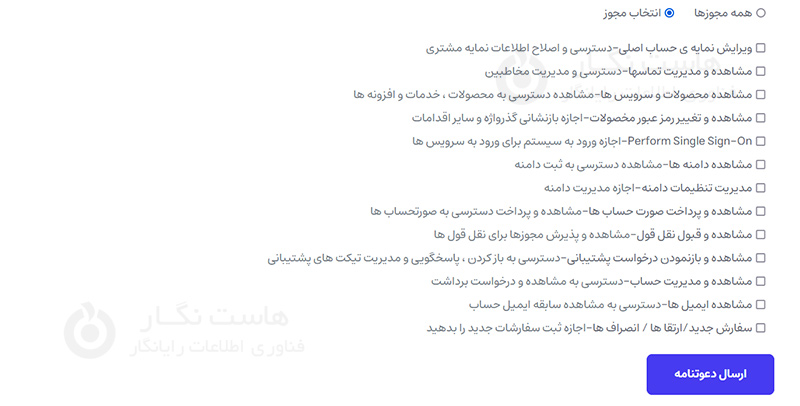 اما با انتخاب گزینه "انتخاب مجوز" یک زیر منویی باز میشود که میتوانید انتخاب نمایید که کاربر دیگر چه سطح دسترسی داشته باشد و به کدام قسمت های پنل دسترسی داشته باشد و بتواند تغییرات را انجام دهد.