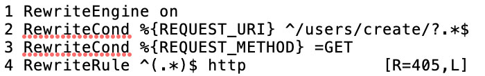 همانطور که مشاهده میکنید، یک flag در انتهای قانون با R=405 وجود دارد. این به صراحت بیان می کند که کد پاسخ باید 405 باشد، که به کاربر نشان می دهد که منبع وجود دارد، اما روش HTTP ارائه شده مجاز نبود. اگر دستورالعمل های عجیب و غریب Rewrite را در فایل htaccess. یافتید که حاوی دستورالعمل مشابهی است، سعی کنید به طور موقت آنها را comment کنید. سپس می توانید وب سرور خود را مجددا راه اندازی کنید تا ببینید آیا تغییر شما مشکل را حل کرده است یا خیر.