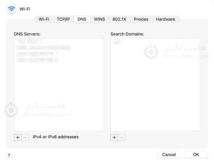 برای انجام این کار در macOS، به System Preferences > Network > Advanced > DNS بروید:
