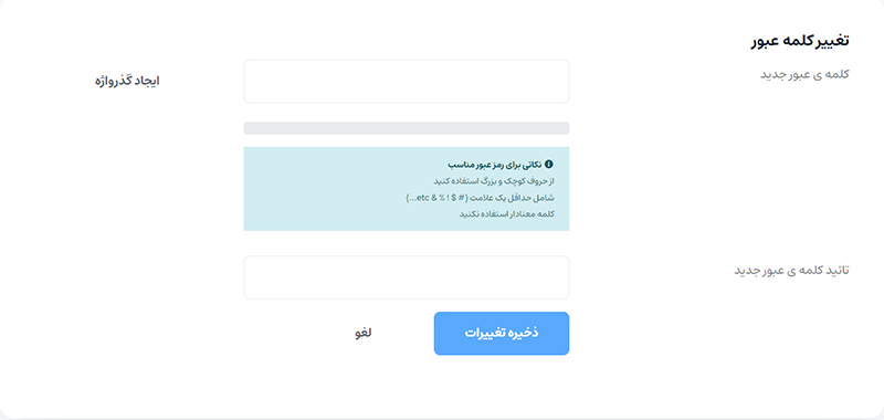 وارد صفحه زیر شده و رمز عبور جدید خود را در فیلد وارد کنید تکرار رمز را در فیلد تایید رمز عبور جدید وارد کنید روی گزینه ذخیره تغییرات کلیک کنید رمز عبور جدید برای هاست شما ست می شود و میتوانید با رمز جدید در هاست لاگین نمایید .