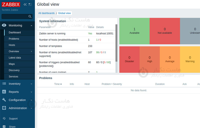 22. پس از ورود به پنل مدیریت Zabbix، می توانید پیکربندی Zabbix را شروع کرده و منابع شبکه جدید را برای نظارت توسط سرور Zabbix اضافه کنید.