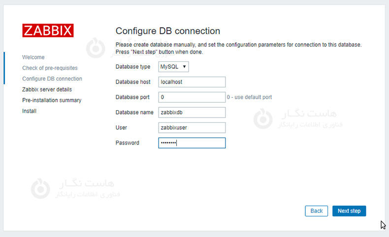 18. در مرحله بعد، هاست (یا آدرس IP) و پورت سرور Zabbix را تهیه کنید و نامی برای نصب frontend Zabbix. وقتی کارتان تمام شد، برای ادامه، Next را بزنید.