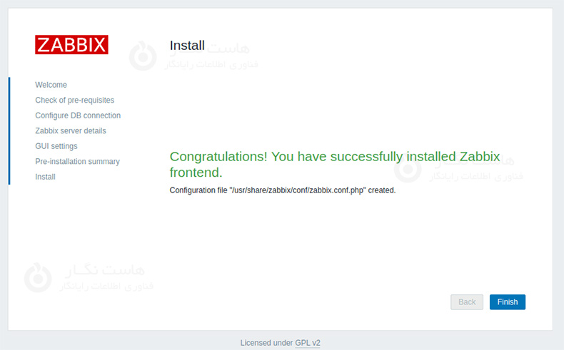 20. پس از اتمام مراحل نصب، پیام تبریک در مرورگر شما ظاهر می شود. دکمه Finish را فشار دهید تا از نصب کننده Zabbix خارج شوید.