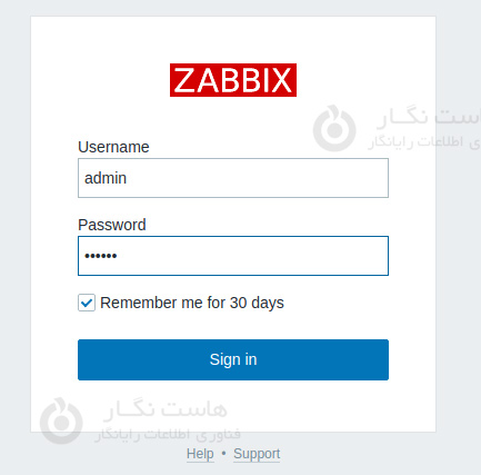 21. در نهایت، با افزودن آدرس URL /zabbix به آدرس IP سرور یا نام دامنه خود بروید و با اعتبار پیش فرض ارائه شده در زیر وارد پنل مدیریت وب Zabbix شوید.
