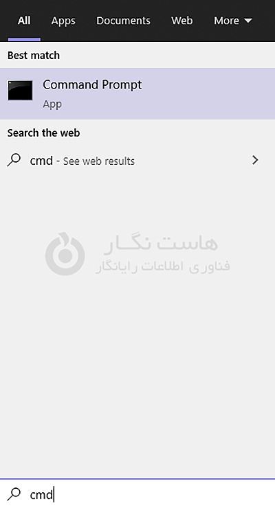 همچنین، میتوانید به قسمت سرچ ویندوز خود رفته و عبارت Command Prompt یا cmd را تایپ کنید. تا برای شما برنامه را بیاورد.