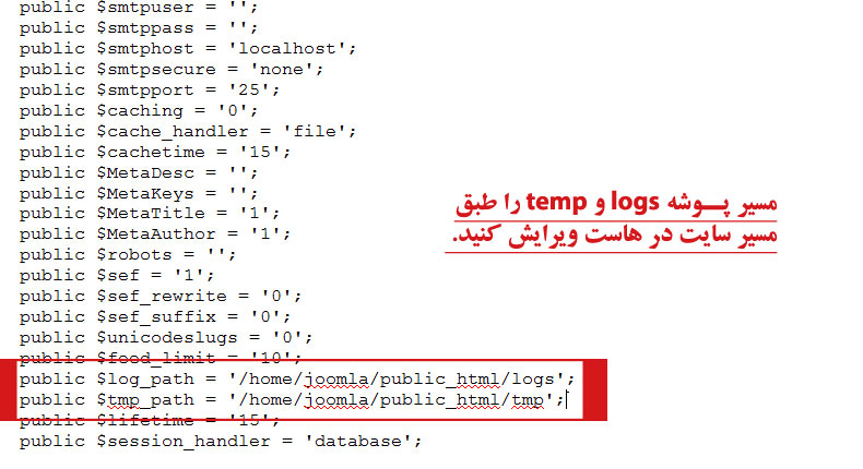 همچنین باید مسیر پوشه logs و پوشه tmp را طبق مسیر پوشه های موجود در هاست خود ویرایش کنید .