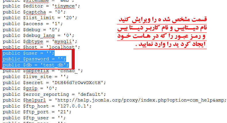 طبق تصویر زیر باید سه خط مشخص شده را ویرایش کنید در قسمت public $ user نام کاربر دیتابیس و در قسمت public $password رمز عبور کاربر دیتابیس و در public $db نام دیتابیس که در هاست خود ساختید را وارد نمایید و در پایان کار روی گزینه save کلیک نمایید .