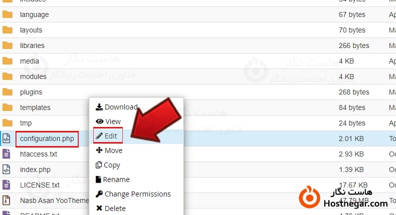 در مرحله ی آخر کار شما باید فایل configuration.php را ادیت کنید بدین منظور فایل مورد نظر را انتخاب کرده و در نوار منو روی گزینه Edit کلیک کنید .