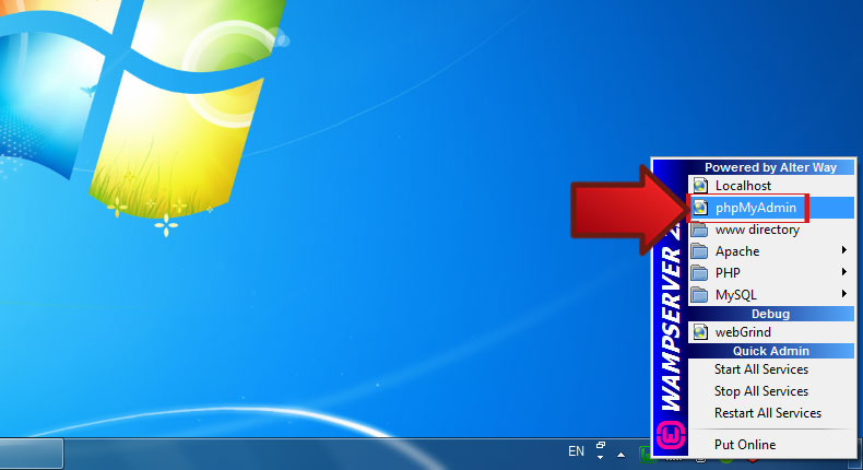 مرحله ي بعد نوبت فشرده سازي ديتابيس مربوط به سايت مي باشد بدين منظور دوباره بر روي آيکن wamp server کليک کرده و اين بار وارد php my admin شويد .