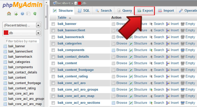 پس از ورود به ديتابيس جداول موجود در ديتابيس مشاهده مي شود براي اينکه بتوانيد از پايگاه داده خروجي بگيريد در نوار منوي بالاي جداول روي گزينه Export کليک کنيد .