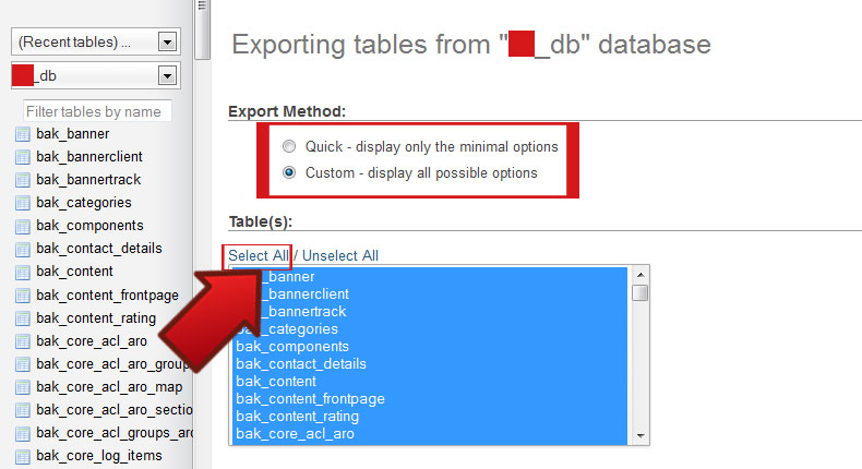 روي گزينه custom کليک کنيد سپس در قسمت(Table(s 'گزينه selectAll را انتخاب کنيد تا تمام جداول موجود در بانک اطلاعاتي انتخاب شود .