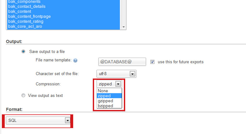 در قسمت output در بخش compression گزينه zipped و در قسمت Format گزينه SQL را انتخاب کنيد .