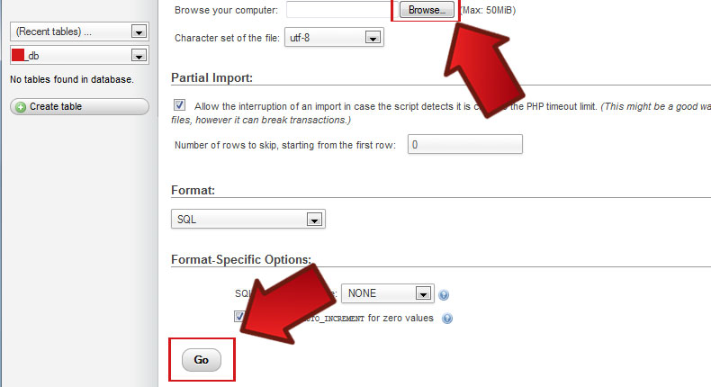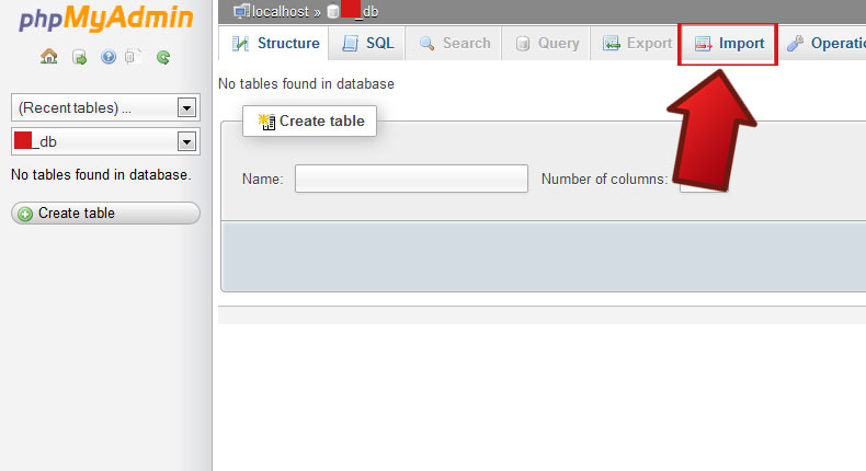 پس از ورود در نوار منوی بالا روی گزینه Import کلیک کنید تا بتوانید فایل فشرده مربوط به دیتابیس سایت خود را آپلود کنید .