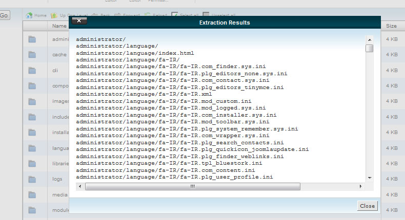 پس از پایان پنجره Extraction Reasults نمایش داده می شود و تمام فایل های موجود در پوشه سایت شما را نمایش می دهد روی گزینه close کلیک کنید . همانطور که میبینید تمام فایل ها به داخل هاست شما منتقل می شود .