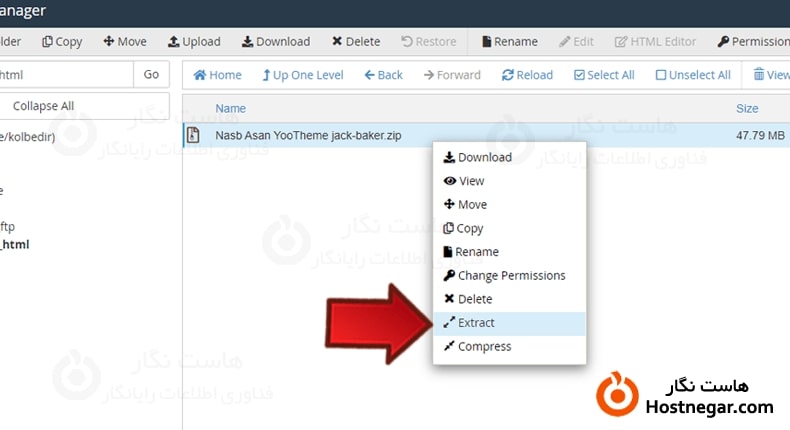 بعد از اتمام آپلود فایل شما به محتویات پوشه public_html افزوده می شود فایل مورد نظر را انتخاب کرده و روی گزینه Extract کلیک کنید تا فایل از حالت فشرده خارج شود . مسیر Extract فایلها را پوشه ی public_html انتخاب کنید .