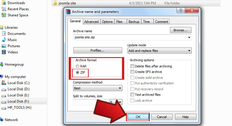 در قسمت archive format گزينه Zip را انتخاب کرده و بر روي Ok کليک نماييد به اين ترتيب شما فايل زيپ سايت خود را آماده کرده ايد .