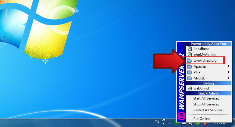 wamp server را فعال کنيد در مرحله ي اول از انتقال بر روي آيکن wamp server کليک کنيد و وارد پوشه ي www directory شويد .