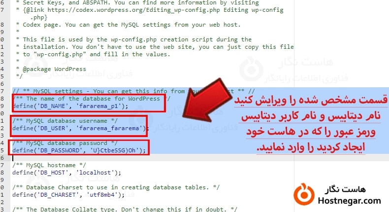 طبق تصویر زیر باید سه خط مشخص شده را ویرایش کنید در قسمت DB_NAME نام دیتابیس ، DB_User نام کاربر دیتابیس و در قسمت DB_PASSWORD رمز عبور کاربر دیتابیس که در هاست خود ساختید را وارد نمایید و در پایان کار روی گزینه save کلیک نمایید .