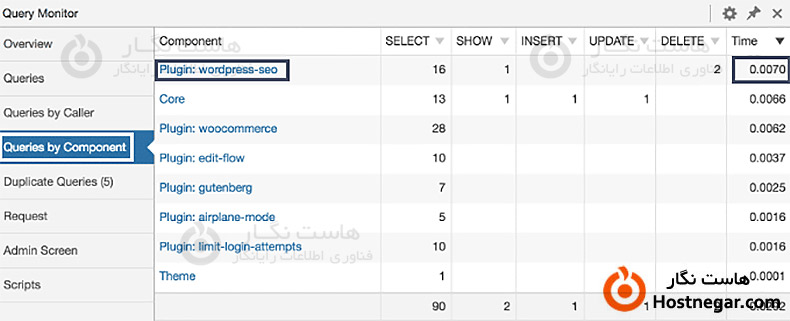 مسیر Query Monitor >> Queries By Component را دنبال کنید، در این قسمت شما میتوانید لیست کند ترین پلاگین ها و زمان بارگذاری آن ها را بررسی کنید.