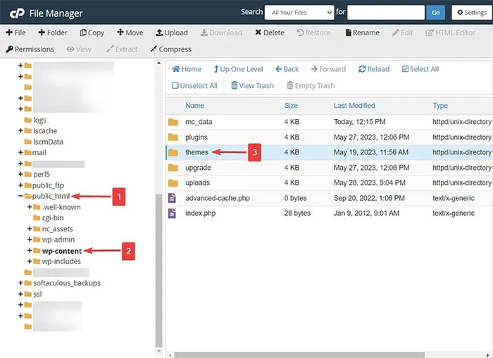 در مدیریت فایل، به public_html → wp-content → themes بروید. قالب سایت فعال سایت شما باید در داخل پوشه themes قرار گیرد. برای غیرفعال کردن قالب فعلی، پوشه themes را انتخاب کنید، کلیک راست کنید و نام پوشه را تغییر دهید.