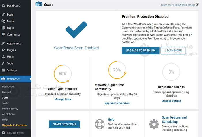 آلودگی به بدافزار یکی دیگر از دلایل رایج خرابی وب سایت وردپرس است. برای اینکه بدانید وب سایت شما به بدافزار آلوده شده است یا خیر، باید وب سایت خود را با استفاده از یک افزونه امنیتی اسکن کنید. اگر همچنان می توانید به داشبورد وردپرس خود دسترسی داشته باشید، یک افزونه امنیتی را انتخاب کنید، آن را نصب کنید و سایت خود را با استفاده از افزونه اسکن کنید. اسکن باید چند دقیقه طول بکشد تا کامل شود.