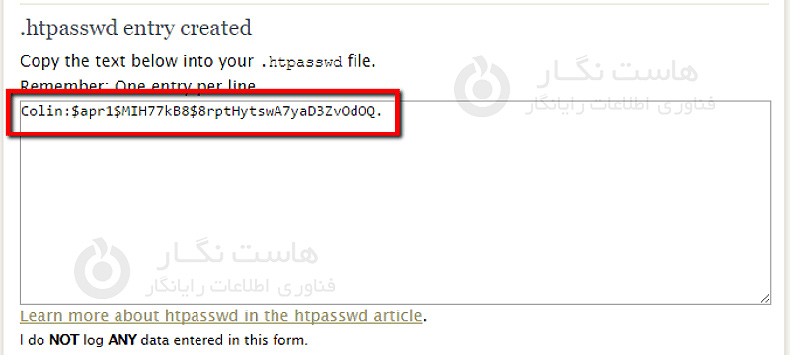 مرحله 1: به Htpasswd Generator رفته و نام کاربری و رمز عبور دلخواه خود را وارد کنید. سپس روی ایجاد فایل .htpasswd کلیک کنید. این ابزار به طور خودکار رمز عبور شما را رمزگذاری می کند و متنی را به شما می دهد تا به فایل htpasswd خود اضافه کنید: