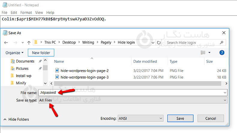 مرحله 2: آن متن را به فایلی به نام “.htpasswd” اضافه کنید و آن را در دایرکتوری اصلی سایت وردپرس خود آپلود کنید. می توانید از چیزی مانند Notepad برای ایجاد فایل استفاده کنید. فقط مطمئن شوید که آن را با استفاده از گزینه All Files ذخیره کنید:
