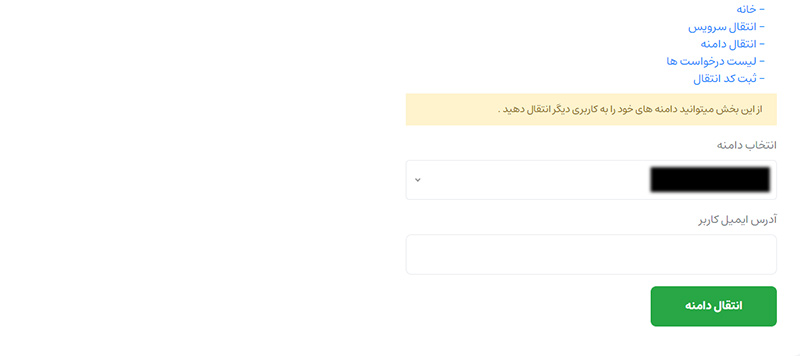 برای انجام اینکار بر روی لینک انتقال دامنه کلیک نمایید، تا بخش مربوطه برایتان باز شود، سپس از بین دامنه هایتان میتوانید دامنه مورد نظر خود را انتخاب کنید و همچنین در ادامه آدرس ایمیل کاربری که میخواهید دامنه برای آن انتقال یابد را وارد و گزینه انتقال دامنه را بزنید، و در ادامه نیز همانند انتقال سرویس میبایست عمل کنید.