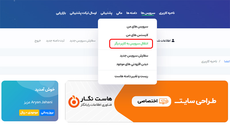 برای انجام این کار ابتدا میببایست وارد حساب کاربری خود در هاست نگار شوید، سپس در گزینه های بالای صفحه بر روی انتقال سرویس به کاربر دیگر کلیک نمایید.