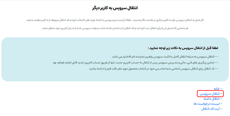 در این صفحه نکاتی اعم از اینکه در صورت انتقال سرویس دیگر به آن سرویس از طریق حساب دسترسی نخواهید داشت، را برای انتقال سرویس به شما یادآوری میکند.