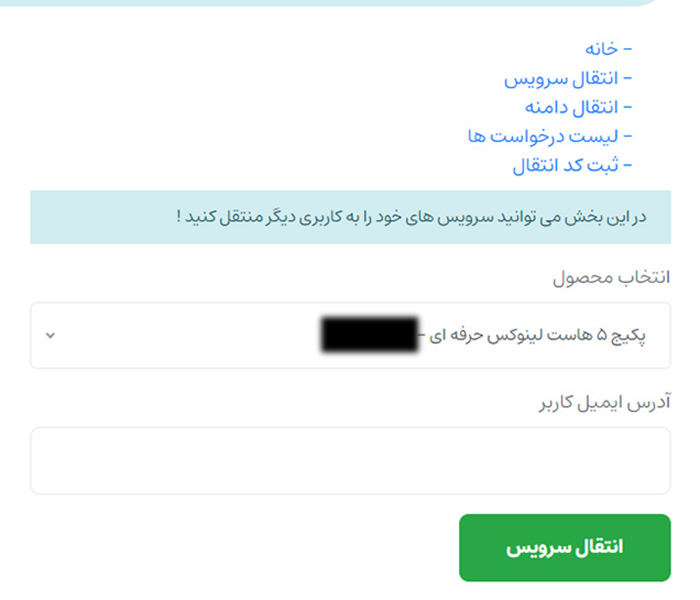 برای انجام اینکار بر روی لینک انتقال سرویس کلیک نمایید، تا بخش زیر برایتان باز شود، سپس از بین سرویس هایتان میتوانید سرویس مورد نظر خود را انتخاب کنید و همچنین در ادامه آدرس ایمیل کاربری که میخواهید سرویس برای آن انتقال یابد را وارد و گزینه انتقال سرویس را بزنید، و سپس آن را تایید کنید.