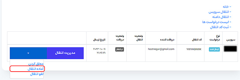 در مرحله بعد میبایست بر روی لینک لیست درخواست ها کلیک نمایید، در بخش باز شده در آخر بر روی فلش آن کلیک کنید و گزینه آماده انتقال را انتخاب کنید. سپس کد داده شده در قسمت کد انتقال را دریافت و در دسترس کاربر دیگری که قصد انتقال سرویس به ایشان را دارید قرار دهید.